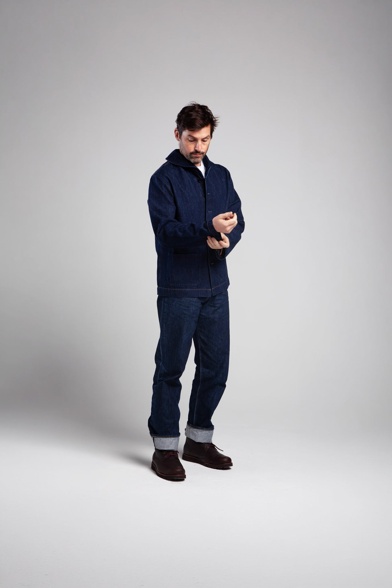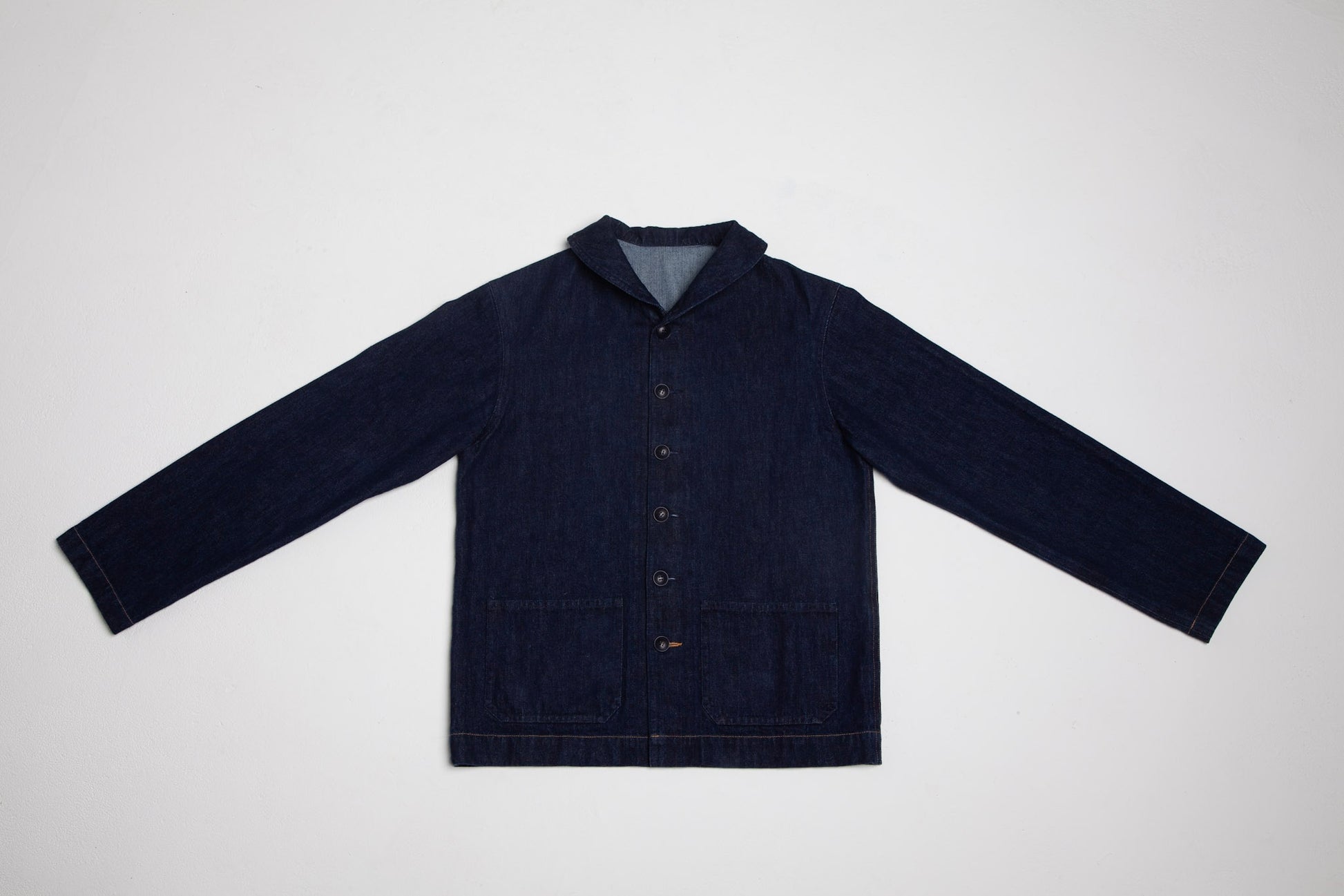 A shawl collar denim shirt as worn by the US Navy. Constructed from 13.75 oz American selvedge denim. Pre-washed for an immediate broken-in handle. The selvedge runs vertically behind the placket on both sides. Anchor-etched buttons. Fits true to size. Handmade in the UK.
